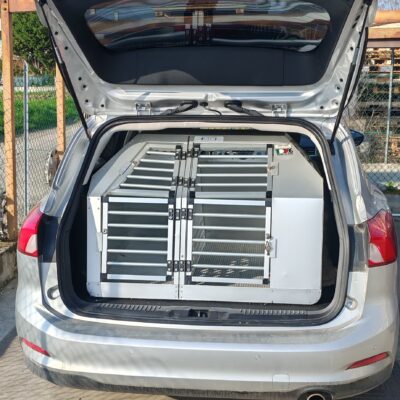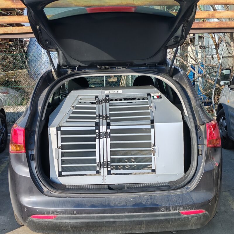 DIMENSIONI: L100xP90xh65cm (con inclinazione frontale per il portellone e posteriore per i sedili come da disegno tecnico in foto) su misura per Kia Ceed SW, ma adatto a numerose altre auto Station Wagon ( come Foscus sw, Astra sw, Megan sw, VW Passat,…). Adatto a cani di taglia media e grande con altezza al garese fino a 65cm. In buone condizioni, come da foto.
