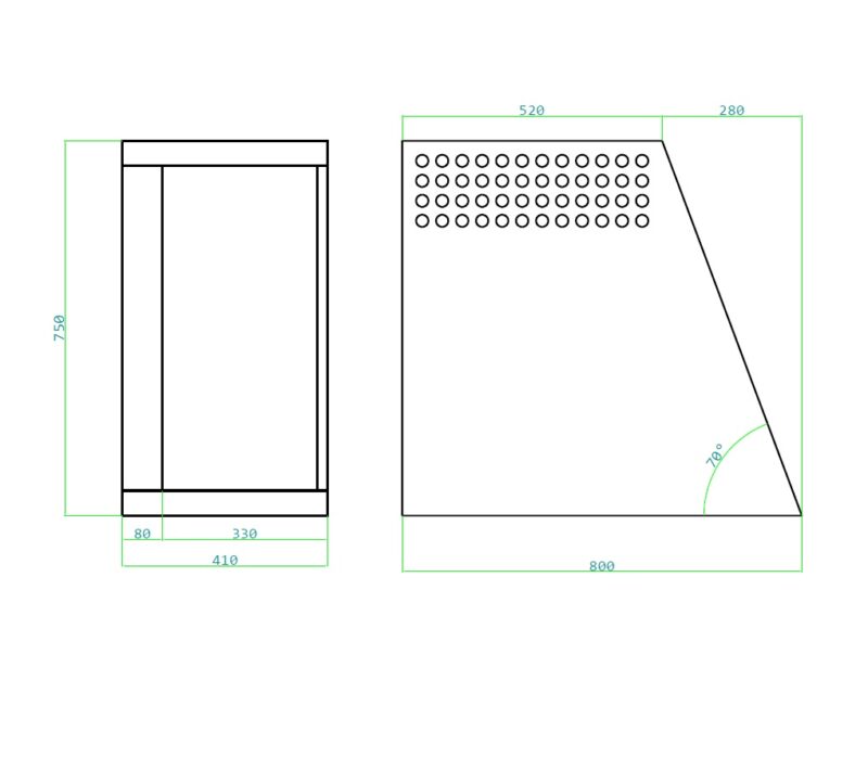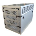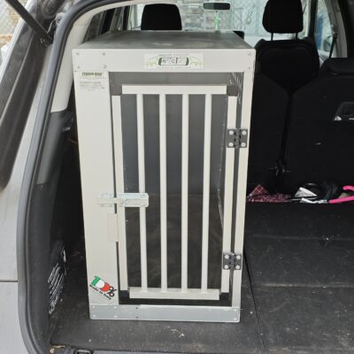 Relizzato integralmente in alluminio anodizato, 1 posto, porta a sbarre con chiusura a chiavistello, gomma sul fondo, fori di aereazione sui lati e sulla schiena.